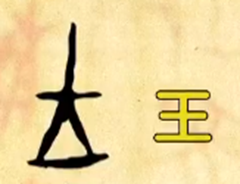 这个王字,最初就是像一把钺的形象,你看它下面还是有弧度的吧,这是个柄,那么,为什么王像钺,不是王这个人像钺,是钺是王权力的象征,所以王字就像一把钺。所以王代表权力。