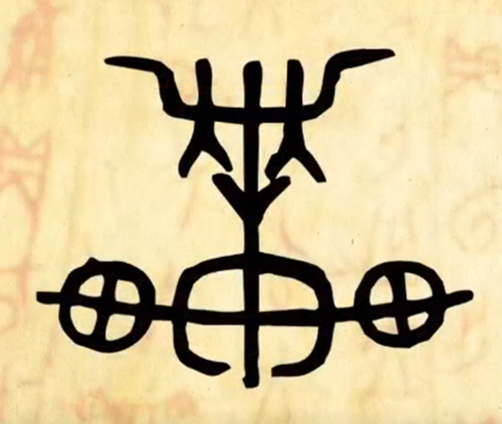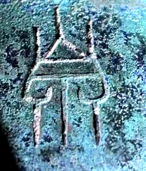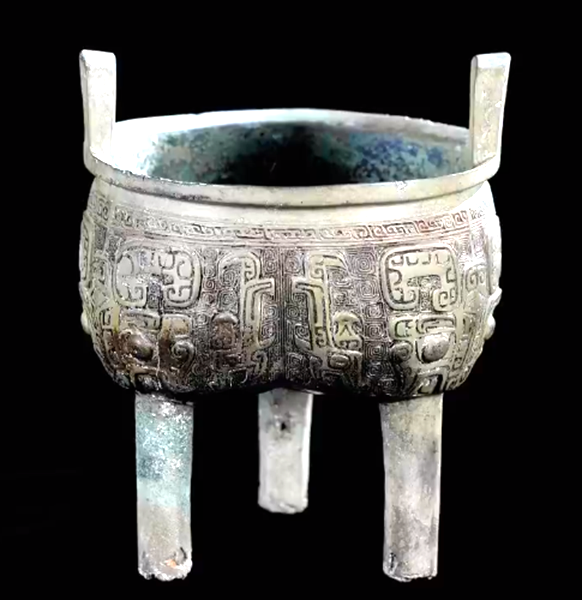 这是一件青铜鼎(商代晚期)也就是鬲与鼎的一种混合体,通高26.7厘米,器身由三组兽面纹围成一周,每组兽面对应一个圈足,内壁靠近上沿部位有一个清晰的符号化铭文,这件器物被国家定级为一级文物。觉得它好像就是个标志。
