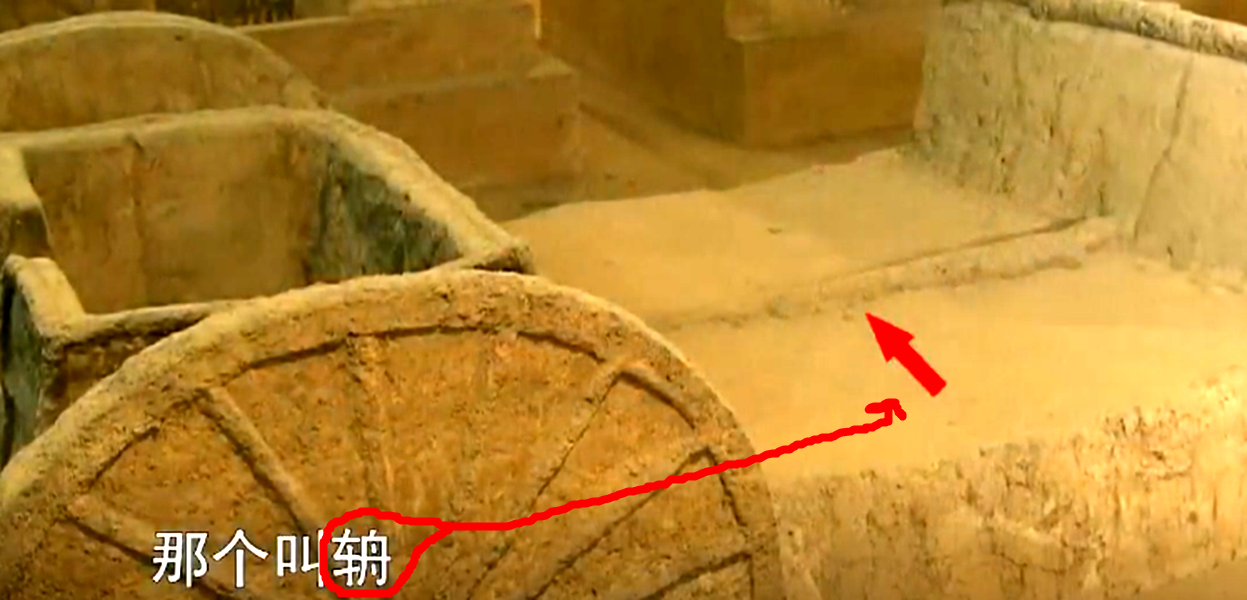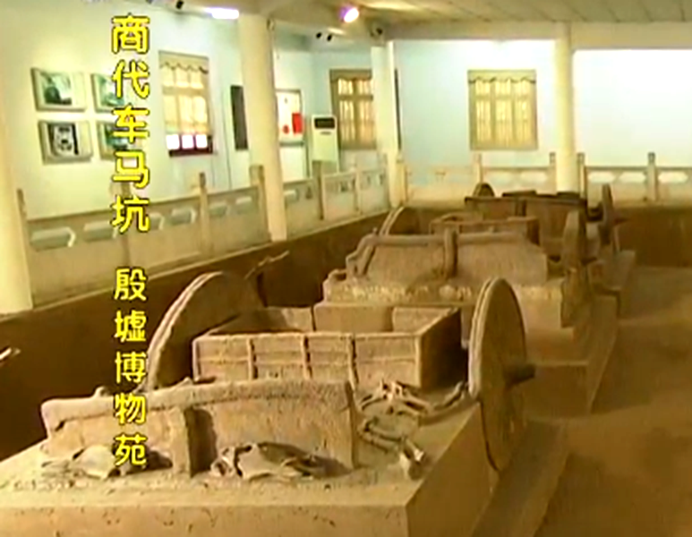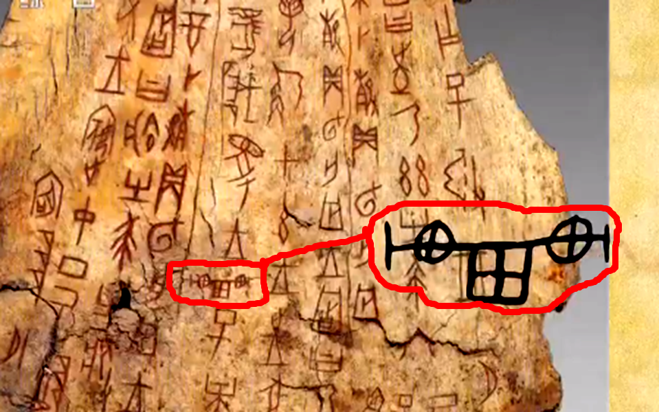两边是车轮,中间是车厢,它是平面和立体,你看,它的组合,这个车跟出土的车几乎一模一样。殷墟到目前为止共挖出100多辆车。这甲骨文的车字跟出土的商代车是一模一样,后边是两个轮子,这个轮子大概有1米多高,上面有18根辐条,两个轮子中间那个方的叫车舆,舆底下那个叫輈,加一根往前一个横梁,那个叫车衡。关键是前面有个轭,它那个马上面套着轭,如果马走的时候,就把这个轭带动了,轭带动就把衡往前拉,车就动了。所以,看这字差不多了,应该是这篇卜辞里面的关键字。