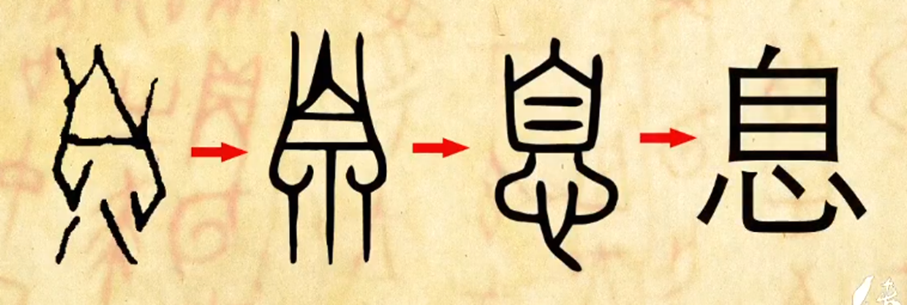 后来为了表达鼻子出气,气息,喘息这个息造了新的一个字,在这个“自”或“鼻子”的下面加两撇,透气了,看到没有,喘息的息,我们老祖宗太了不起了。