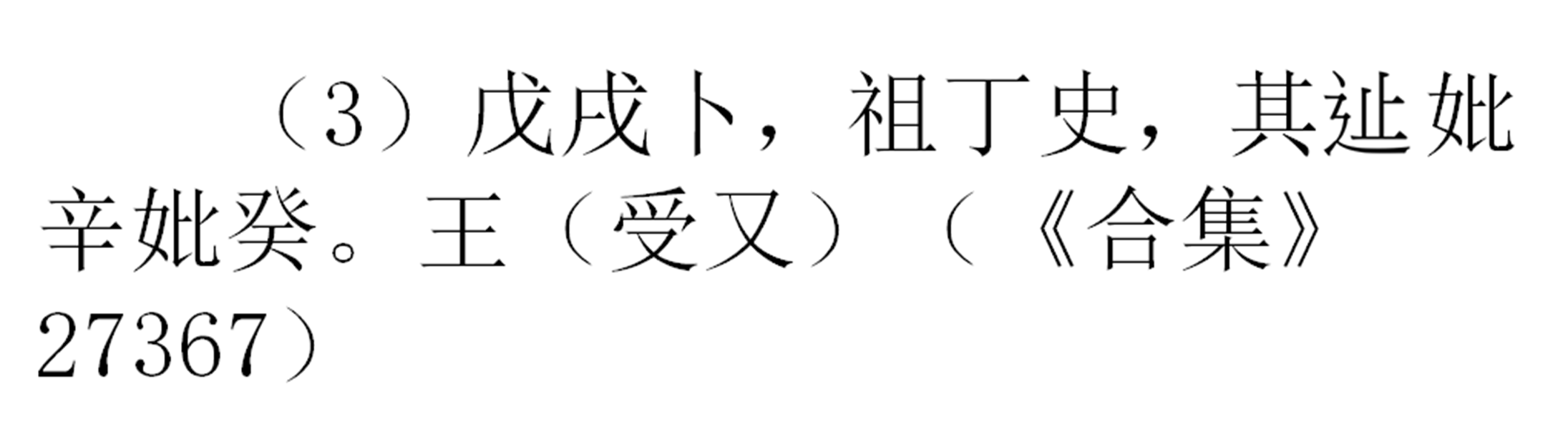 今按。以上 3 例中的“弜”,均可以释朝、祧或征兆。例(10)“岁于小乙”是岁祀于小乙。“弜又”“王受又”,是卜辞习见短语,表示龟右或祧佑,王受保祐。“王受又又”,或表示王受龟兆和庙祧双重保祐。例(11)“弜”独字成句,或释朝,或释庙,或有省略告