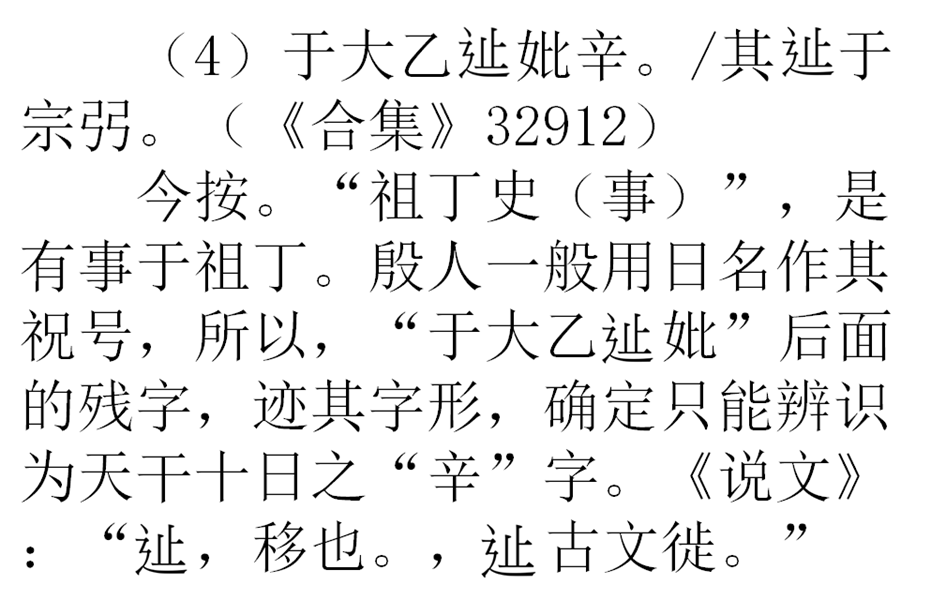 “其徙于宗兆”,大概是贞问是否将妣辛神主牌迁到大乙庙祫祭。反过来读,“弜于宗其徙”,弜释朝或征兆,辞意也通。