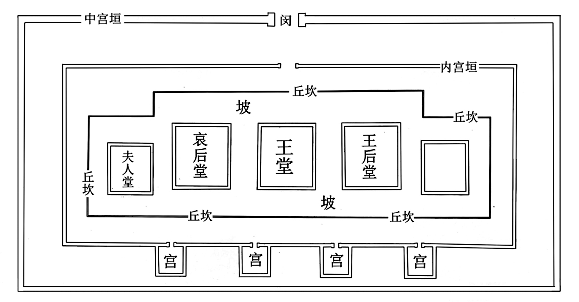 “唯十四年,中山王厝”(中山王厝鼎铭文。厝,本文释安厝),王墓居中,有亚字形椁室,深 8.2 米,大部分开凿于岩石层中,底部长宽为 13.7×12.6 米。墓上封土称“丘”(兆域图版规划有丘坎,中山国“守丘石”上刻有守丘将),残高 9 米(图 4)(河北省文物研究所,1996:104-110)。据傅熹年先生研究,自商代至战国,大型陵墓封土台上一般筑有宫室,有的规模宏大,美轮美奂(傅熹年,1980)。