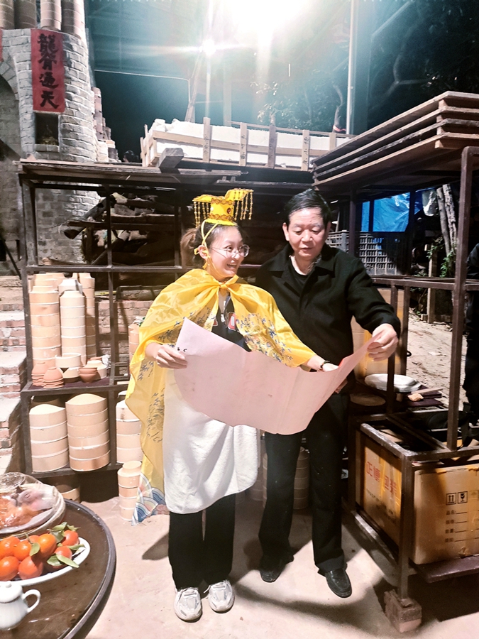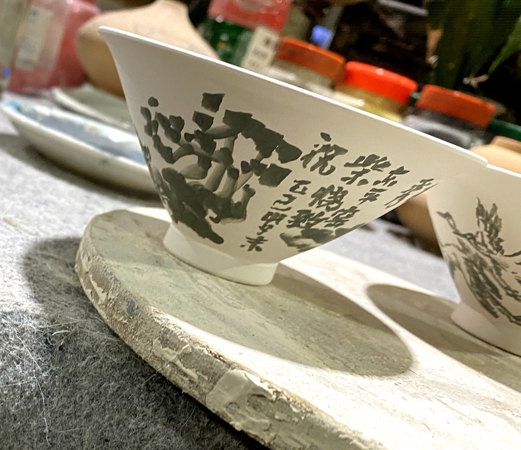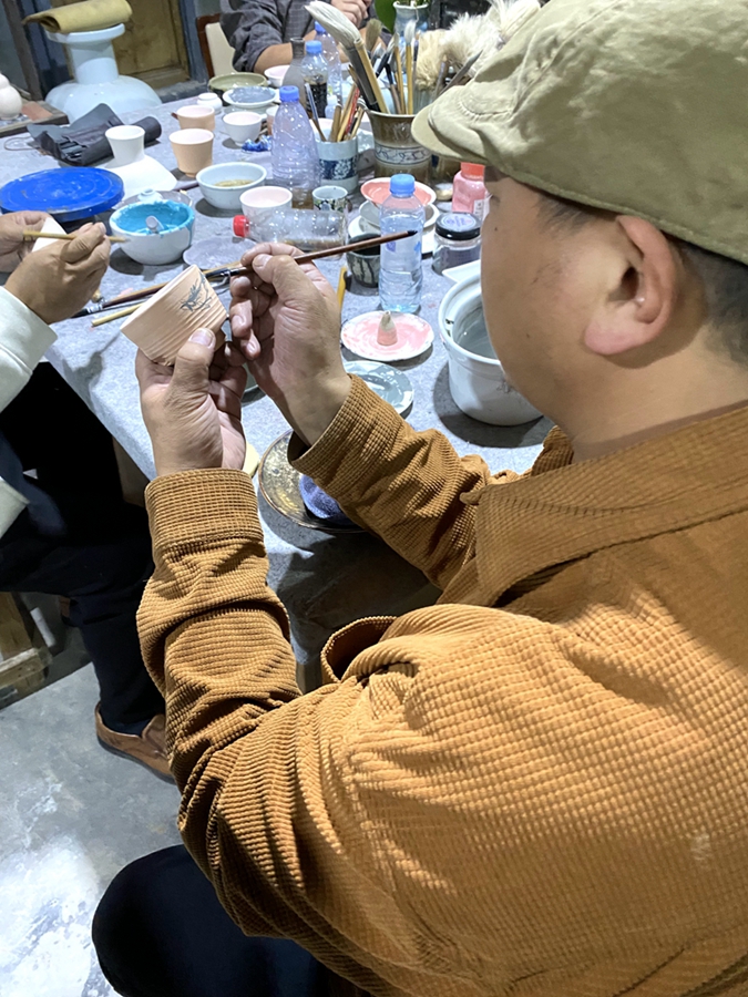 尽管未参与建窑过程,余院长仍为我们详细讲解了窑炉的设计与前期暖炉准备。为把握这次新窑首烧,我午后便提前抵达园区。余院长带领团队井然有序地推进各道工序——绘瓷、装窑、定位,每一环节皆可见其用心。我亦提笔写下“东江流域古陶瓷”青花款,融入这份即将入窑的期待。