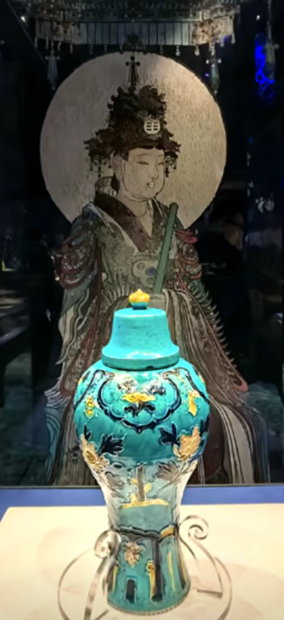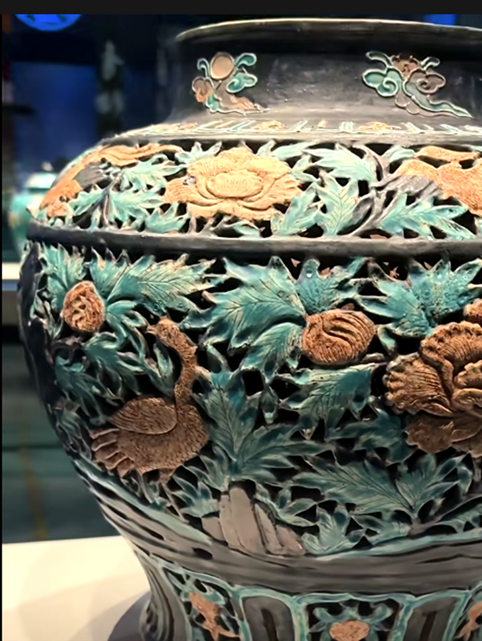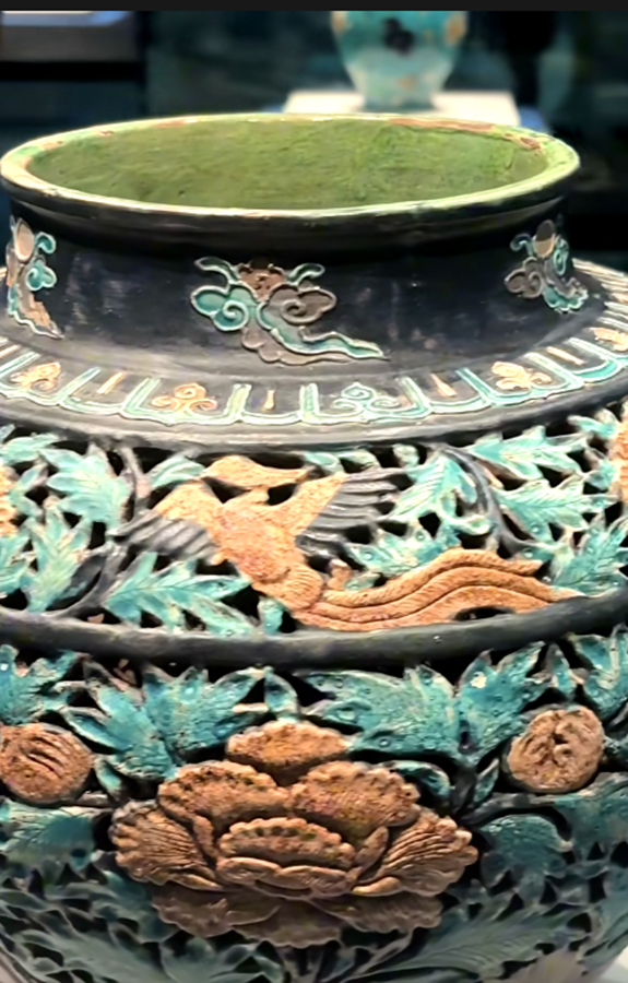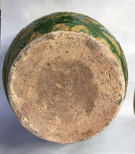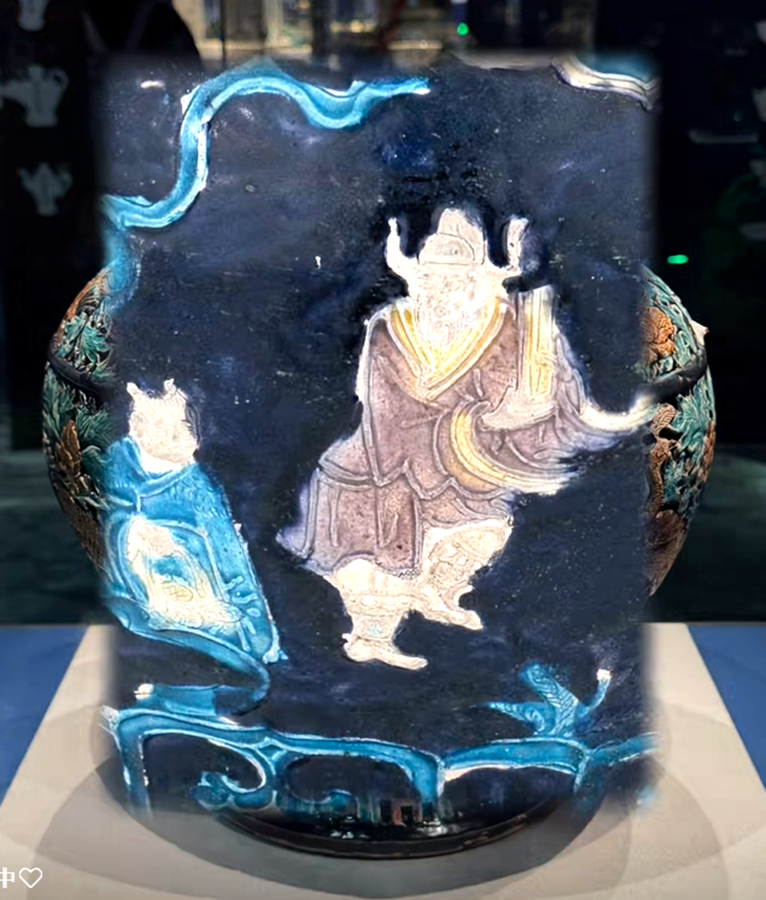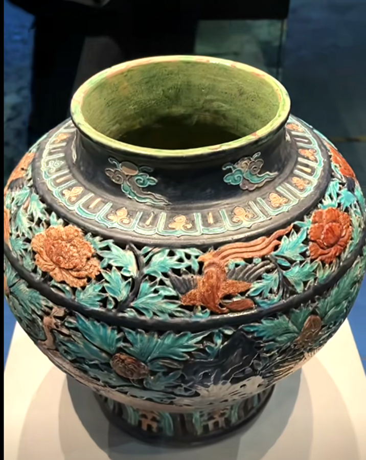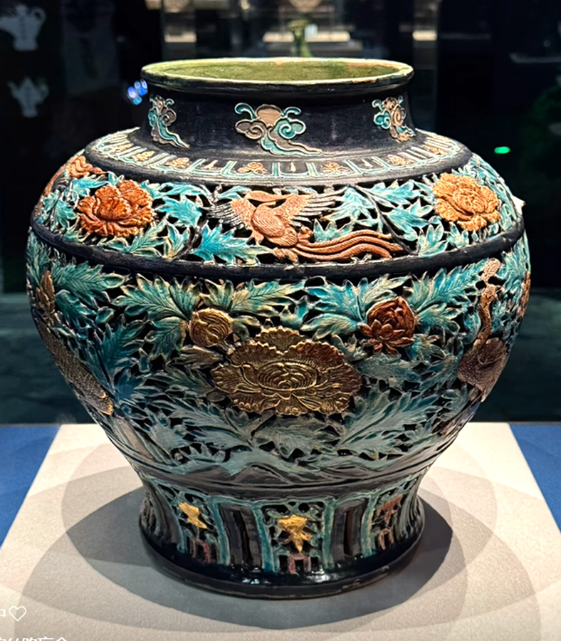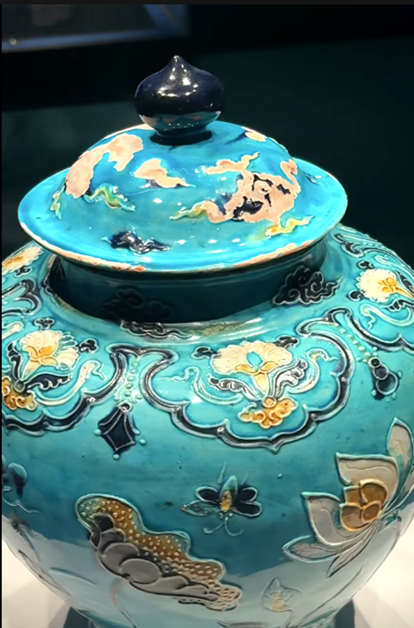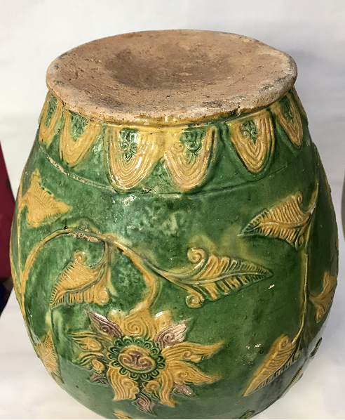 其实珐华彩在明代景德镇高温仿烧之前,除山西外,我们广东的东江中下游也有同类产品。如本馆就有一件明代早期类似藏品:明代三彩堆雕缠枝花卉五系带盖大罐,通高:38.5CM,罐身高:32CM,口径13.5CM,腹径28CM,底足16CM(平底内凹)。此器型硕大,通体施低温绿釉地,盖为珠宝圆锥形扭,盖面中部饰二道弦纹,束颈圆敝口沿,肩部饰五等分双条状纵向五系,深鼓腹,腹部饰堆塑黄色和褐色缠枝莲花卉纹,近底处饰黄色堆塑仰莲瓣纹一周,平底微内凹无釉,其纹饰与元青花缠枝莲纹大罐极为相似,有明显元代遗风,有伤修过。现存“南宝东江流域古陶瓷博物馆”。