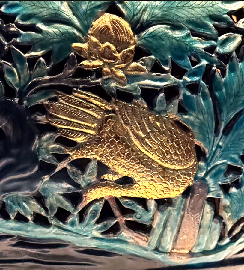 而这件珐华贴金镂空孔雀牡丹纹大罐,就更震憾了,我们可以看到它通体的纹饰,都采用镂空装饰,其中牡丹、孔雀、仙鹤身上都有贴金,而且金彩保存完好,更重要的它局部还以朱砂绘色,那么贴金和朱砂彩绘,能保持这么好的珐华类器物在近几十年来,在世界各大博物馆和拍卖会上几乎都没有见过。它是现在我们已知明代中期珐华器物中的一件顶尖的精品。