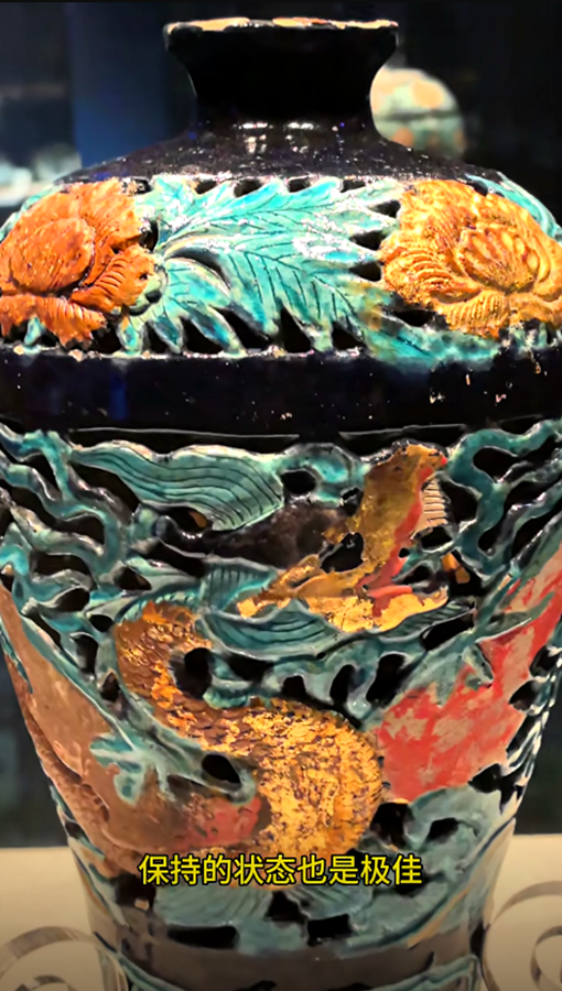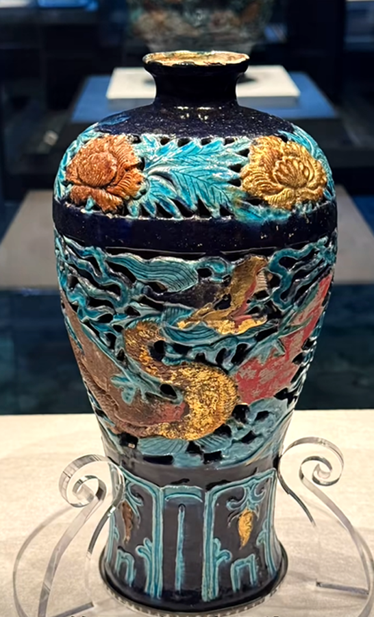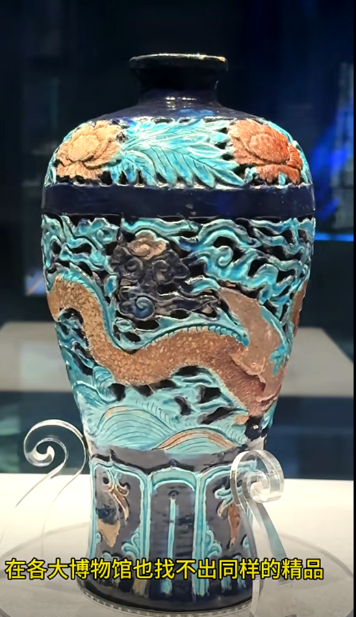 可以与它相匹敌的,就是旁边展览的这件珐华贴金镂空应龙云海纹梅瓶,大家注意,这个龙是长着翅膀的,我们称为应龙。它上面的贴金和朱砂彩绘保持的状态也是极佳,相信在各大博物馆也找不出同样的精品。