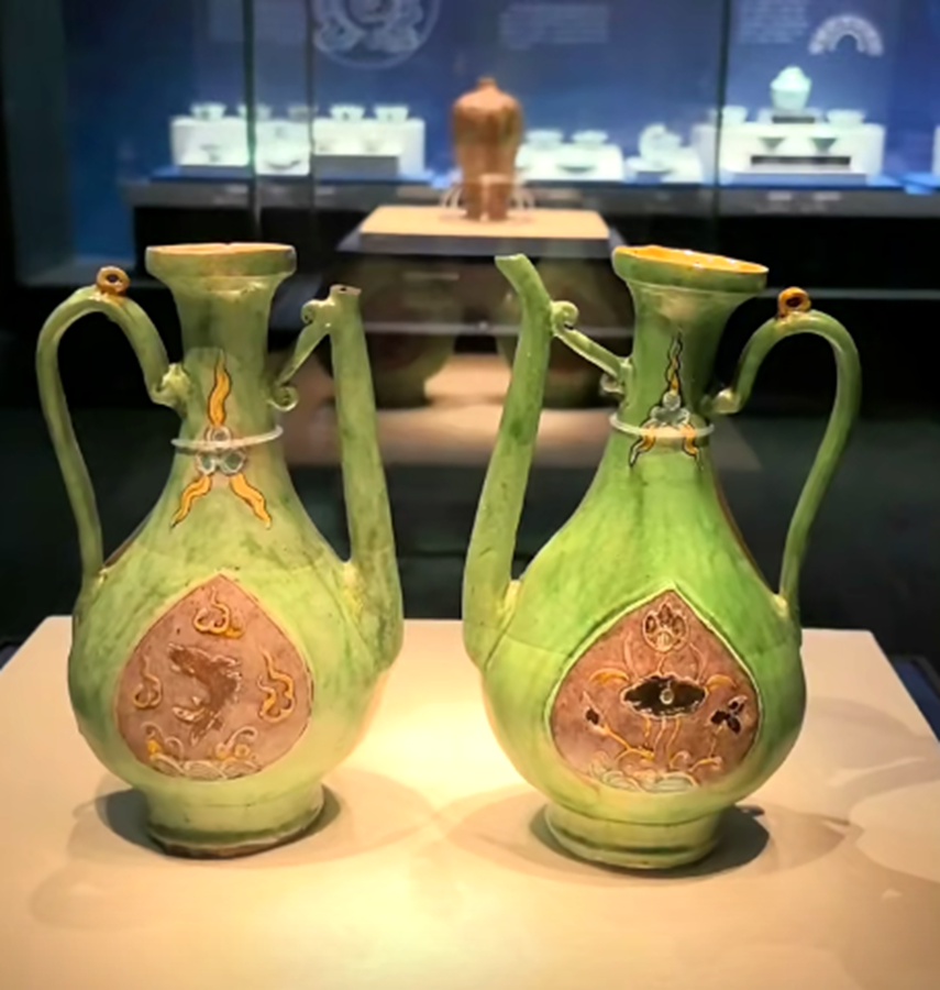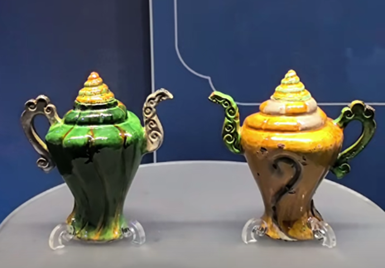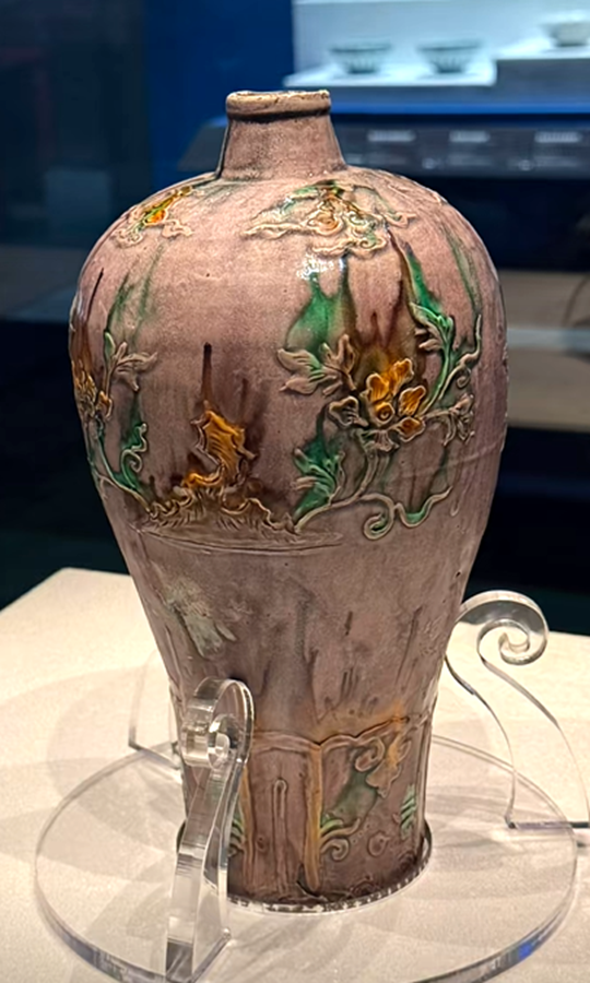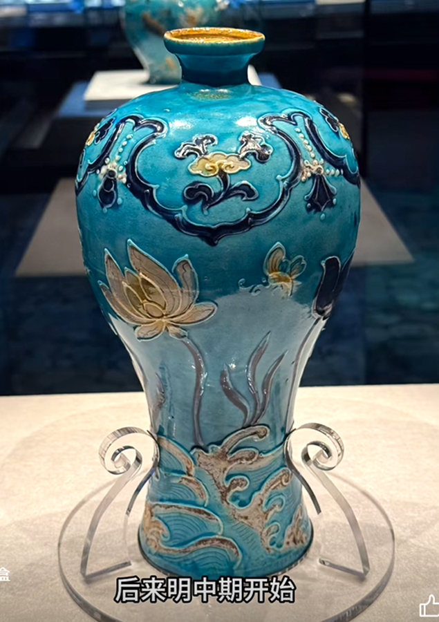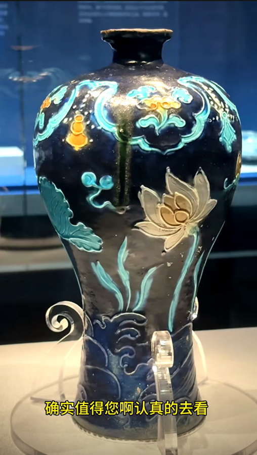 这批珐华器物,确实值得一看,包括还有这种茄皮紫的珐华梅瓶。还有这种绿釉和孔雀绿釉的,这种珐华器物,都是这次沉船出水的精品器物。它们的整体出现,会改变人们对明代珐华器的一个认知。
