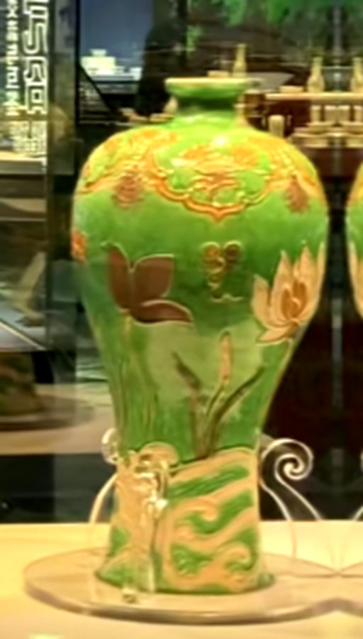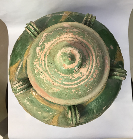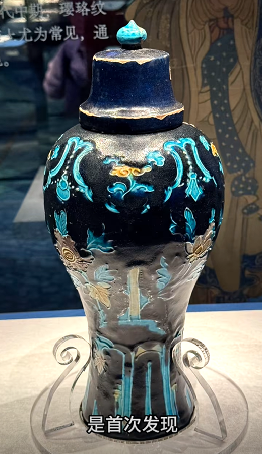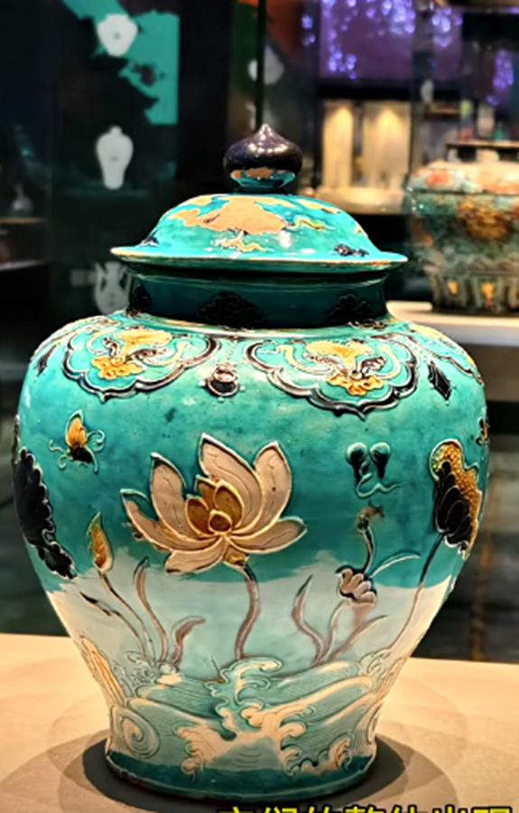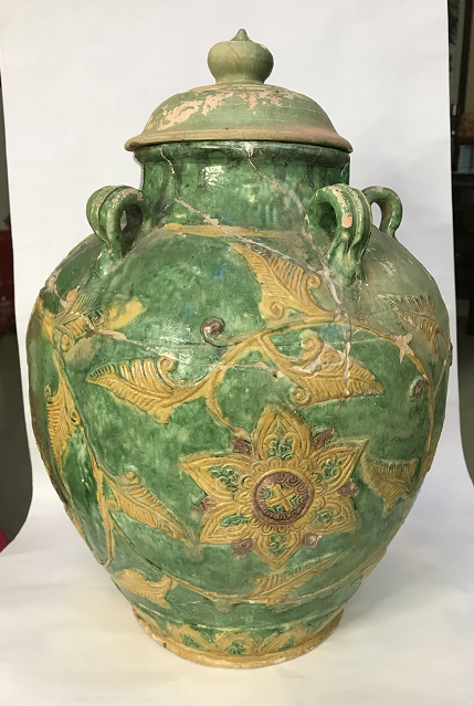 ,重3·8公斤。此器型硕大,通体施低温绿釉地,盖为珠宝圆锥形扭,盖面中部饰二道弦纹,束颈圆敝口沿,肩部饰五等分双条状纵向五系,深鼓腹,腹部饰堆塑金黄和褐色缠枝莲花卉纹,近底处饰黄色堆塑仰莲瓣纹一周,平底微内凹无釉。有明显元代遗风,有伤修过。现存“南,.png)