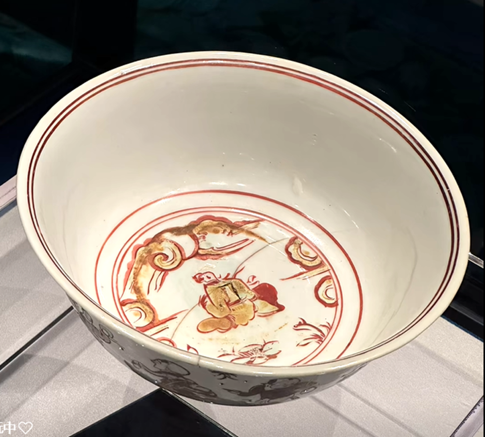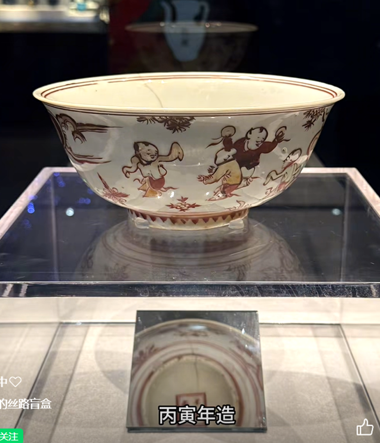 这只红绿彩的婴戏碗,底下带了个干支纪年:单线方框“丙寅年造”四字红款。丙寅是哪一年呢?1506年,就是正德元年。它的发现,基本就将沉船年代锁定在了大约正德年间。