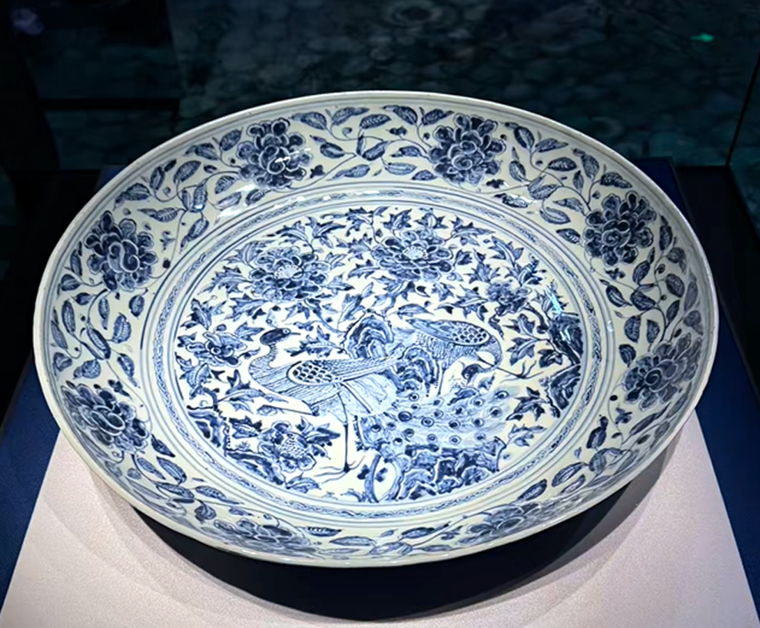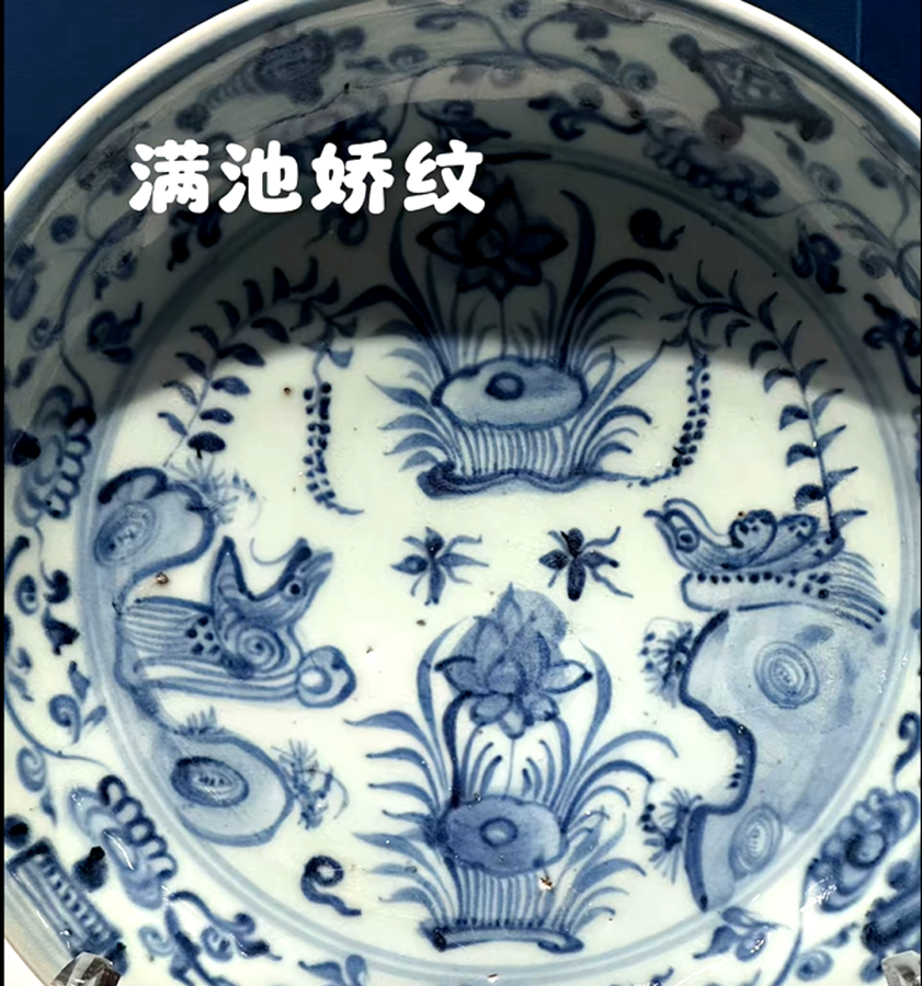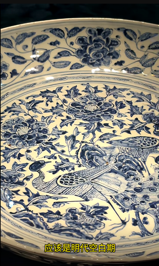比如像这件青花孔雀牡丹纹大盘,尺寸硕大,目测它的直径将近50公分以上,那么这类的大盘,应该是明代空白期偏晚的,也是这批瓷器中相对比较早的。