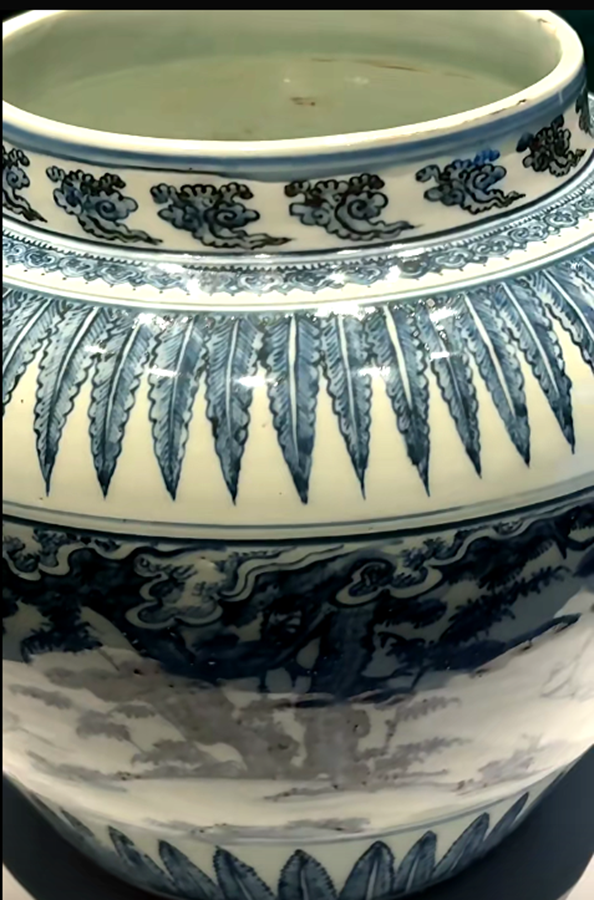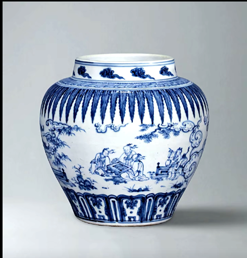 这件青花八仙人物故事圆罐,这个罐有一显著特点,就是它上下都有这种尖细的排列紧密的蕉叶纹,这种青花装饰图案,在明代的青花罐中其实并不多见,存世的几件都被定为成化时期。
