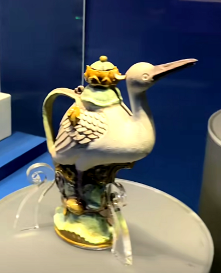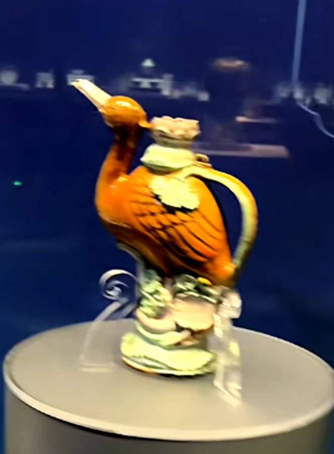 像这件素三彩象形的执壶。就从来没有见过,造型极其可爱。还有这一对素三彩螺形的执壶和这一对素三彩鹭鸶形的执壶,都是首次发现。