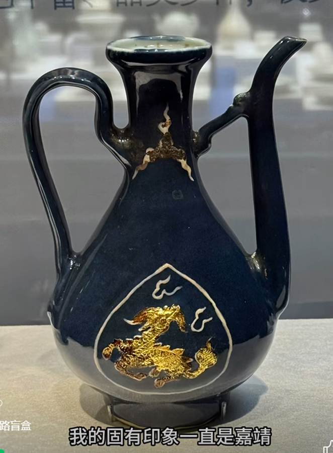 还有像这种蓝釉的,有的带露胎的执壶,这露胎居然也是描金的,过去通常专家一直认为是嘉靖的,现在看其实年代也要提前一点。