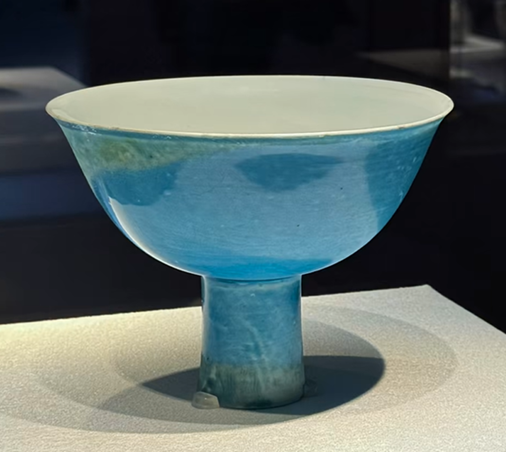 比如这件,非常漂亮的孔雀蓝釉的高足杯,从器型和釉色来看,很像明代正德早期的作品。